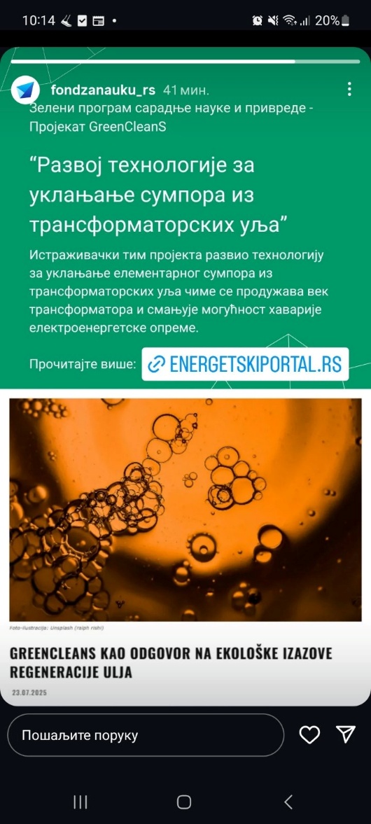 Пројекат GreenCleanS GRANT No. 6700, финансиран у оквиру Зеленог програма сарадње науке и привреде, Фонда за науку Републике Србије, успешно је завршен. Носилац пројекта, Електротехнички институт Никола Тесла акционарско друштво, заједно са партнерима, Технолошко-металуршким факултетом и Институтом за хемију, технологију и металургију, Универзитета у Београду, остварио је значајне резултате у развоју технологије за третман минералих трансформаторских уља.